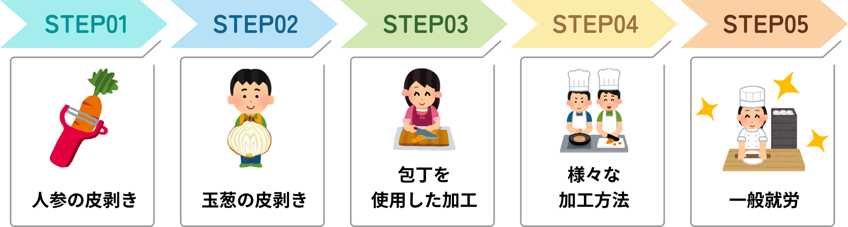 作業スキルと衛生管理の知識をステップアップ形式で習得できるプログラムです。「実践力」と「知識」の両方をバランスよく身に付けることで、即戦力として活躍できる人材を目指します。